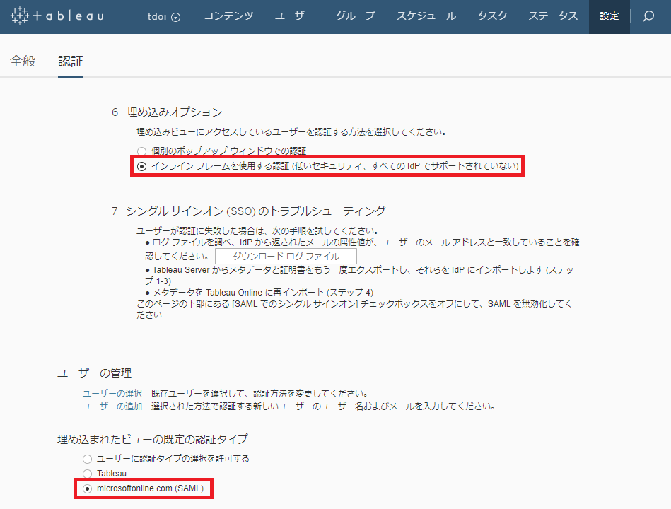 Tableau Online を他のアプリケーション等に埋め込んで使用したい場合は以下 2 か所を設定することで、認証連携できます。 (参考) Embedded Dashboard Displays a Login Prompt Button with SAML (SSO) Authentication