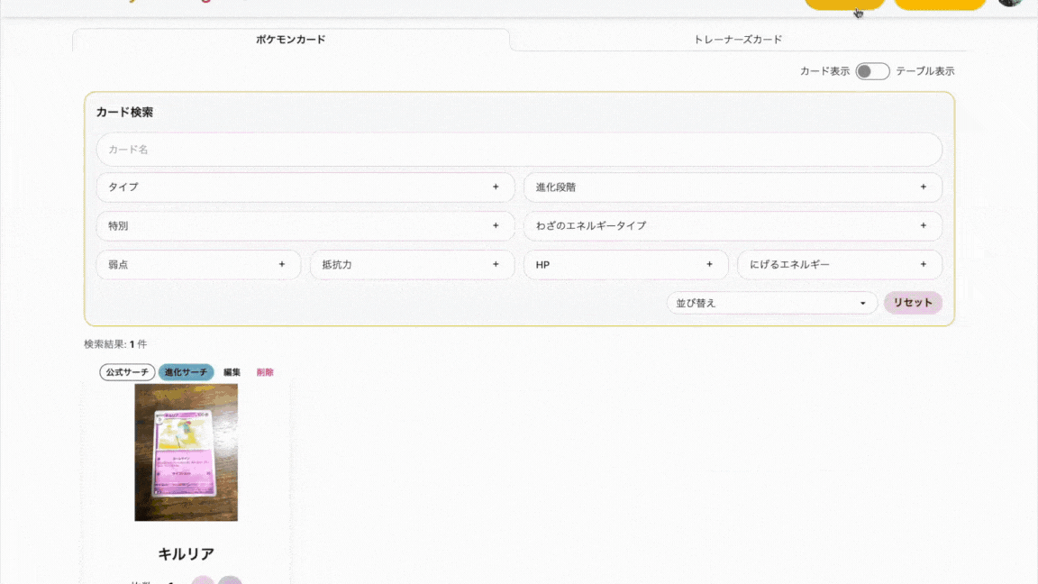 これにより、「水タイプのたねポケモンで、HPが〇〇以上のやつ」といった曖昧な条件でも、手持ちのカードからすぐに候補を見つけ出すことができます。