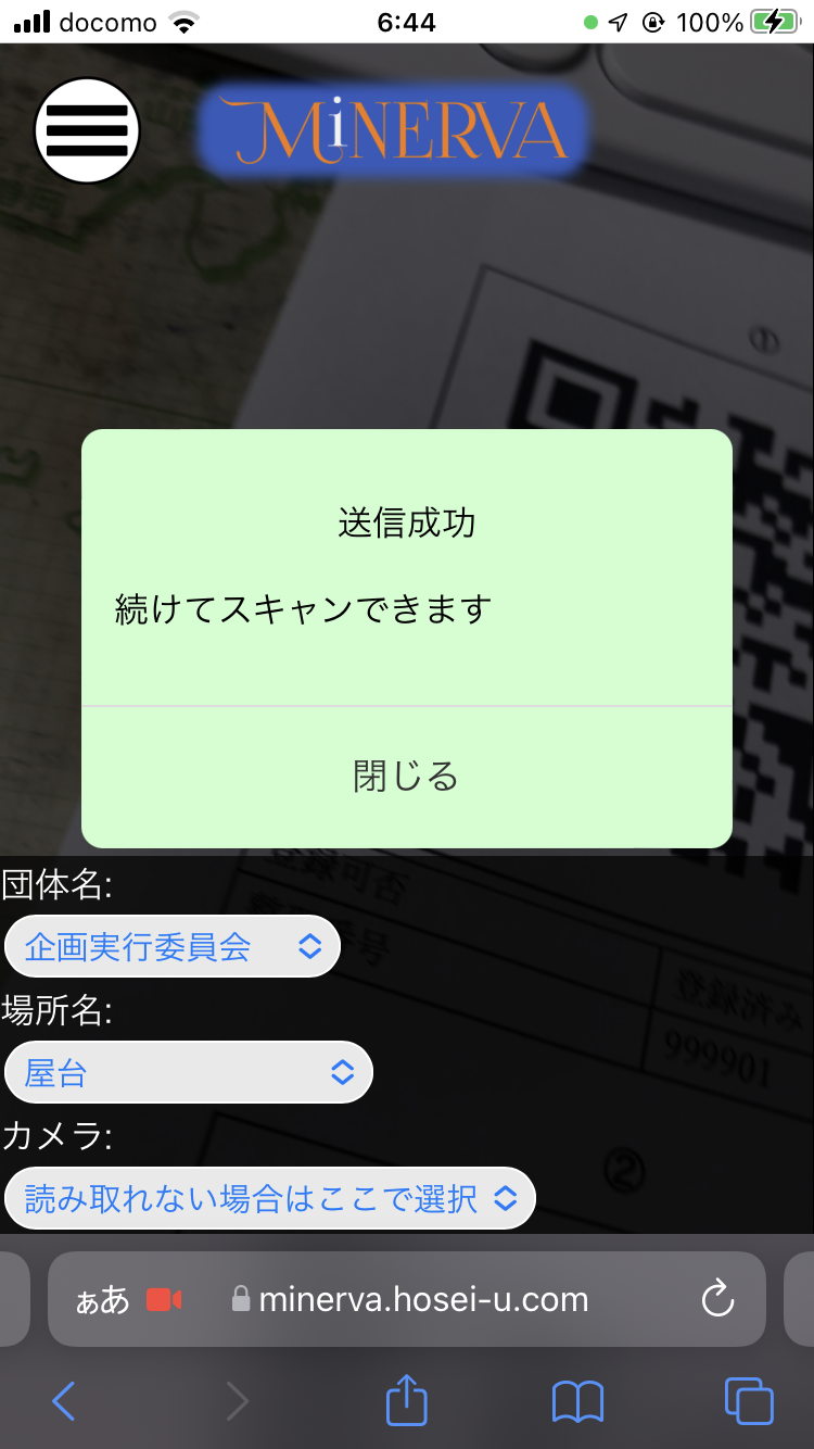 一つのQRコードを標準カメラで読み込むと初回登録画面へ、MiNERVAのスキャナーで読むと場所の登録ができるようになりました。