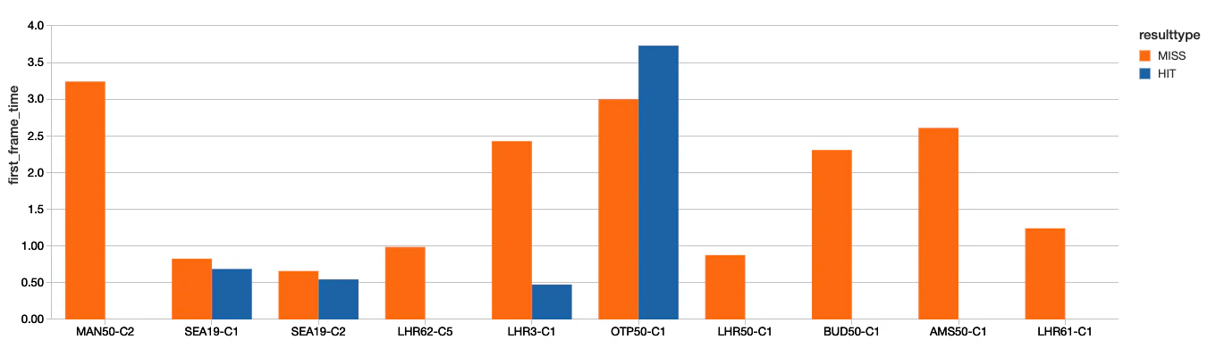 ビデオのロード時間(最初のフレームまでの時間)は、お使いのCDN、この場合はAWSのCloudFrontエッジノードのそれぞれの場所におけるパフォーマンスの理解に役立ちます。これは、複数のCDNにユーザートラフィックを分散させるか、AWSのCloudFrontであればエッジ上のLambdaを用いて動的に接続元を選択する機能を実装するかと言った、KPIを改善するための戦略に直接インパクトを与えます。