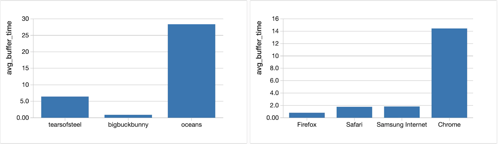 ハイレベルでのバッファリング、それによる貧弱なビデオ品質の体験を理解できずにいることは、購読者の解約率に重大な影響をもたらします。さらに、視聴者のエンゲージメントを減少させるような広告に対して、広告提供者はお金を支払いたいとは思わないでしょう。それらの広告はさらにバッファリングを追加することになるので、広告ビジネスにおける収益にもインパクトを与えることになります。この文脈においては、分析者がビデオの品質だけでなく、ブラウザーやアプリケーションのタイプ、バージョンに対する分析が行えるように、アプリケーション側から可能な限りの情報を集取することが重要です。