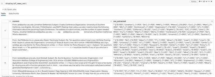 # actual NER inference on the Spark dataframe