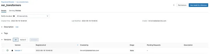 log_model()の呼び出しに一つの引数registered_model_nameを追加していることに気づいたかもしれません。これを行うことで、モデルをどこに保存したのかに関して気にする必要がなくなり、MLflowモデルレジストリから名前でモデルを参照できるようになります!このモデルレジストリは、バージョン管理、ステージ昇格、メタデータのタグ付け、アクセスコントロールのようなキーとなるライフサイクル管理の機能を追加するので、モデルはレイクハウスの一級市民となります。これで、推論パイプラインの名前やバージョン、ステージでモデルを参照することができます。