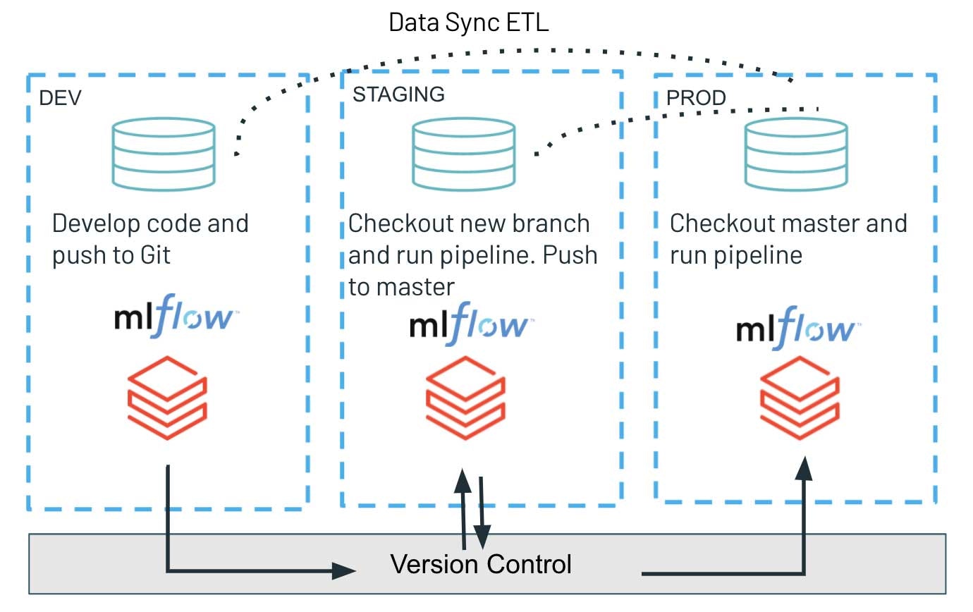 継続的デリバリーのパートではRepos APIのみを活用します。プログラミングインタフェースを通じて、Gitブランチ上の最新のバージョンをチェックアウトし、ワークロードを実行する際に最新のスクリプトをデプロイします。これにより、アーティファクトのデプロイプロセスをシンプルなものにし、テストしたコードバージョンを開発環境、ステージング環境、プロダクション環境へと容易にプロモーションすることができます。このようなアーキテクチャによって、様々な環境の完全に分離することができ、増加しているセキュアな環境においては特に好ましいものとなります。異なるステージ: バージョン管理システムのみを共有するdev、staging、prodによって、非常に重要なプロダクションワークロードとの潜在的な干渉を最小化することができます。同時に、探索的な作業やイノベーションの取り組みは、より緩和されたアクセス制御を持つdev環境として分離されます。
