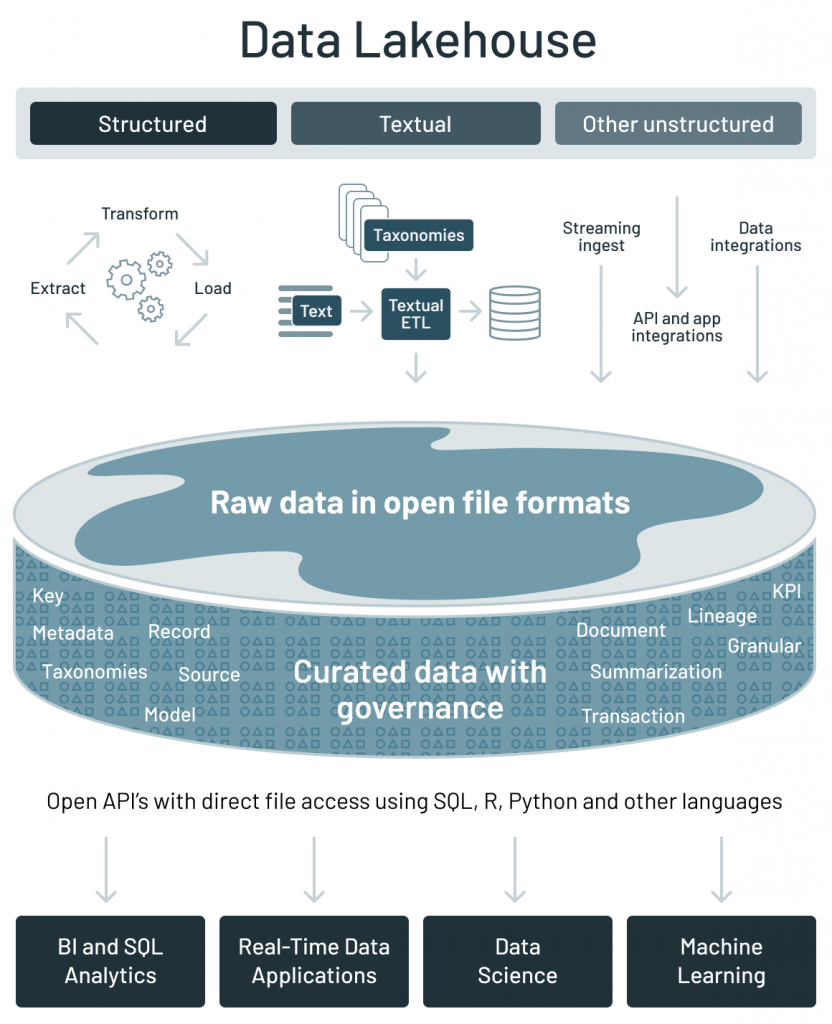 データレイクは企業におけるあらゆる種類のデータを合併したものです。データレイクは、Apache ParquetやORCなどの一般的かつオープンなファイルフォーマットでデータを保持するファイルAPIを用いて、低コストのストレージシステムに企業のデータをオフロードする場所となりました。オープンフォーマットの利用によって、データレイクが機械学習システムのように幅広い他の分析エンジンに直接アクセスできるようになりました。