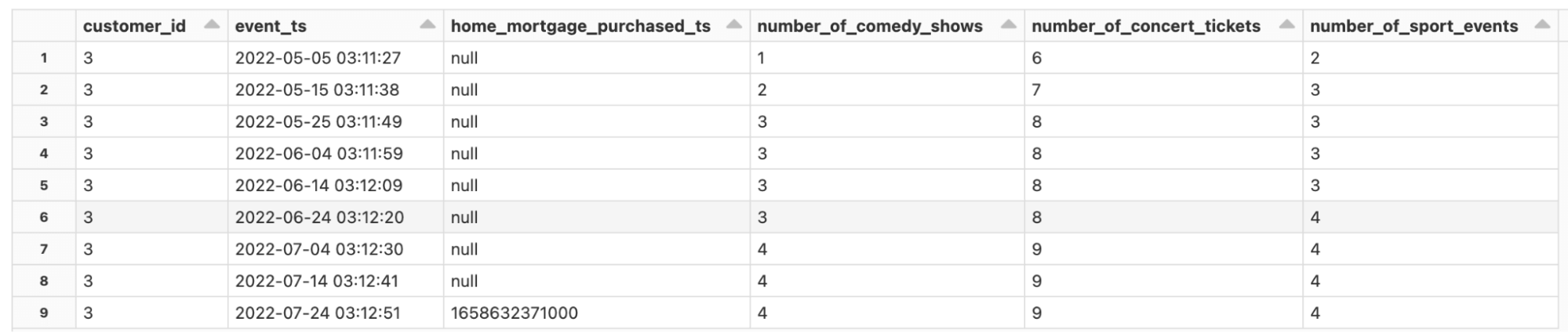 我々のリファレンスパイプラインにおいて取り扱うデータのタイプを覗いてみるために、以下のサンプルをご覧ください。データの時間的特性に注意してください。すべての銀行、融資システムは時間で並べられたトランザクションデータを取り扱い、信頼できるデータソースとは、遅延して到着するデータ、順番が入れ替わったデータに対応できることを意味します。以下に示すコアのデータセットには、当座預金口座(図2)、顧客のアップデート、トランザクションや上流のサードパーティデータから追跡されたであろう行動データ(図3)が含まれています。
