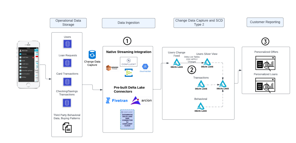 この記事では、OLTPデータベースから、チェンジデータキャプチャ(CDC)、ダッシュボードでのレポーティングに至る、Databricksレイクハウスプラットフォームによる金融サービス向けユースケースにおけるリアルタイム洞察のための、堅牢な基盤をどのように構築するのかを説明します。Databricksは、プラットフォームネイティブのストリーミングを長期間に渡ってサポートしてきています。最近のDelta Live Tables(DLT)のリリースによって、ストリーミングがさらにシンプルになり、新たなCDC機能によってさらにパワフルになりました。最近投稿した包括的なブログ記事では、DLTを用いたCDCのガイドをカバーしています。この記事では、FSI向けのストリーミングにフォーカスし、これらの機能が新製品の差別化要因とFSI内部向け洞察を支援するのかを説明します。