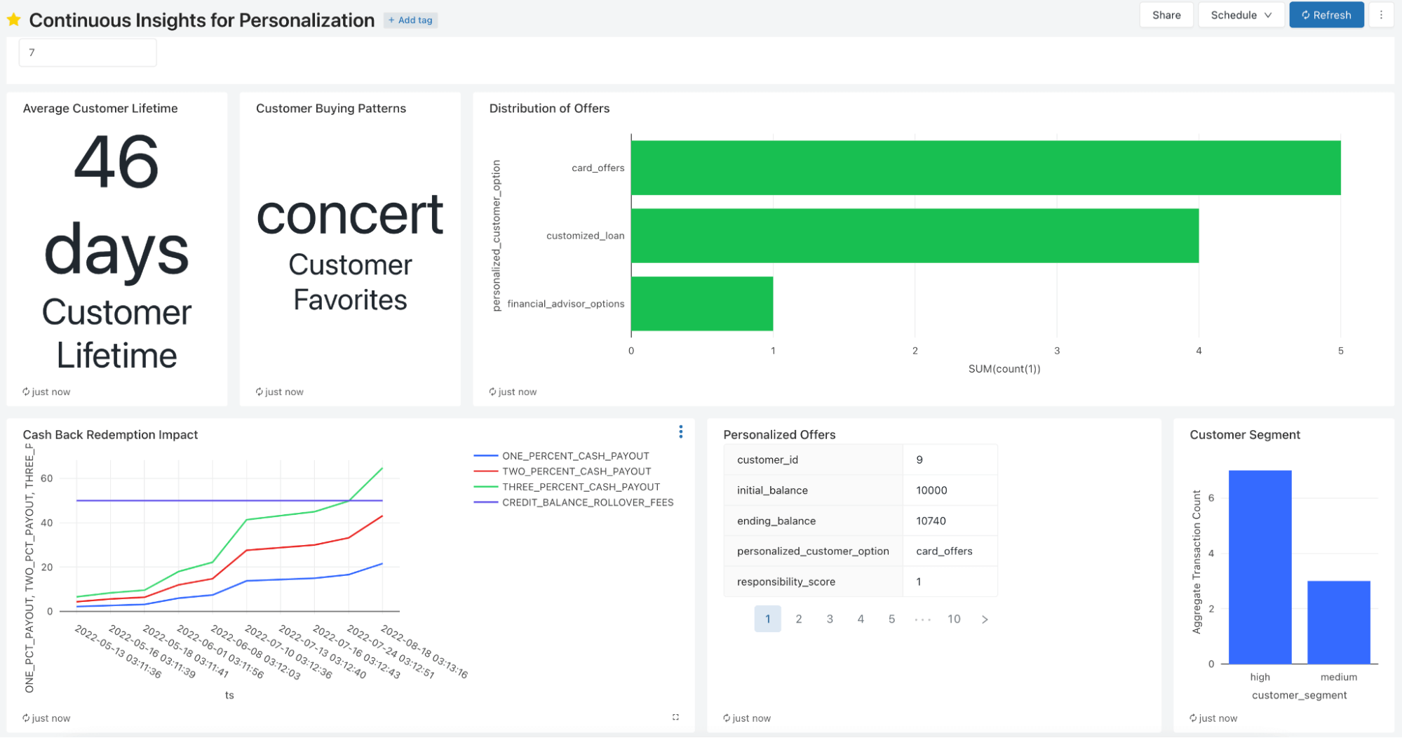 上述したシンプルなデータ取り込みパイプラインを完結するために、ここで我々はレイクハウスを用いることでどのようなタイプの機能と洞察が実現できるのかを説明するために、Databricks SQLのダッシュボードをハイライトします。以下に示すすべてのメトリクス、セグメント、オファーは、この洞察パイプラインのために模したリアルタイムのデータフィードから生成されています。これらは分刻みで更新するようにスケジュールすることもでき、さらに重要なことに、このデータは新鮮かつMLで活用することができるようになっています。特筆すべきメトリクスには、顧客口座の履歴に基づく顧客の生涯価値や処方的なオファー、キャッシュバックによる損失やブレークイーブンの閾値が含まれます。リアルタイムのシンプルなレポートは、どのようにキャッシュバックのオファーのような特定の製品をリリースするのかに関する情報を提供します。最後になりますが、レポート用のダッシュボード(DatabricksあるいはPower BIやTableauのようなBIパートナー)はこれらの洞察を表出化します。洞察が利用できるようになった際には、背後のデータは一つのレイクハウスに集中化されているので、これらを容易にダッシュボードに追加することができます。