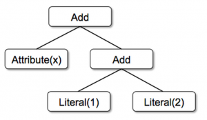 シンプルな例として、上のセクションで紹介した(x+y)+1のようなエクスプレッションを記述できるAdd、Attribute、Literalのツリーを考えてみます。コードジェネレーションがない場合、このようなエクスプレッションはAdd、Attribute、Literalのツリーを下っていくことで、データの行ごとに解釈される必要があります。これは、実行を遅くさせる大量の枝と仮想的な関数呼び出しを引き起こします。コードジェネレーションを用いることで、以下のように特定のエクスプレッションツリーをScalaのASTに翻訳する関数を記述することができます。