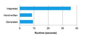 準クォートは適切なASTやリテラルのみで置き換えられることを保証するために、コンパイル時に型チェックを行いますので、文字列結合よりもはるかに使いやすいものとなり、実行時にScalaのパーサーを実行するのではなく、直接ScalaのASTに変換されます。さらに、それぞれのノードに対するコードジェネレーションは、小要素によって返却されるツリーがどのような構成であるのかを知る必要がないので、構築が非常に容易です。最後に、Catalystが見逃したエクスプレッションレベルの最適化が存在する場合、Scalaコンパイラーによって結果のコードがさらに最適化されます。以下の図では、準クォートを用いることで、手でチューニングしたプログラムと同等のパフォーマンスを発揮できることを示しています。
