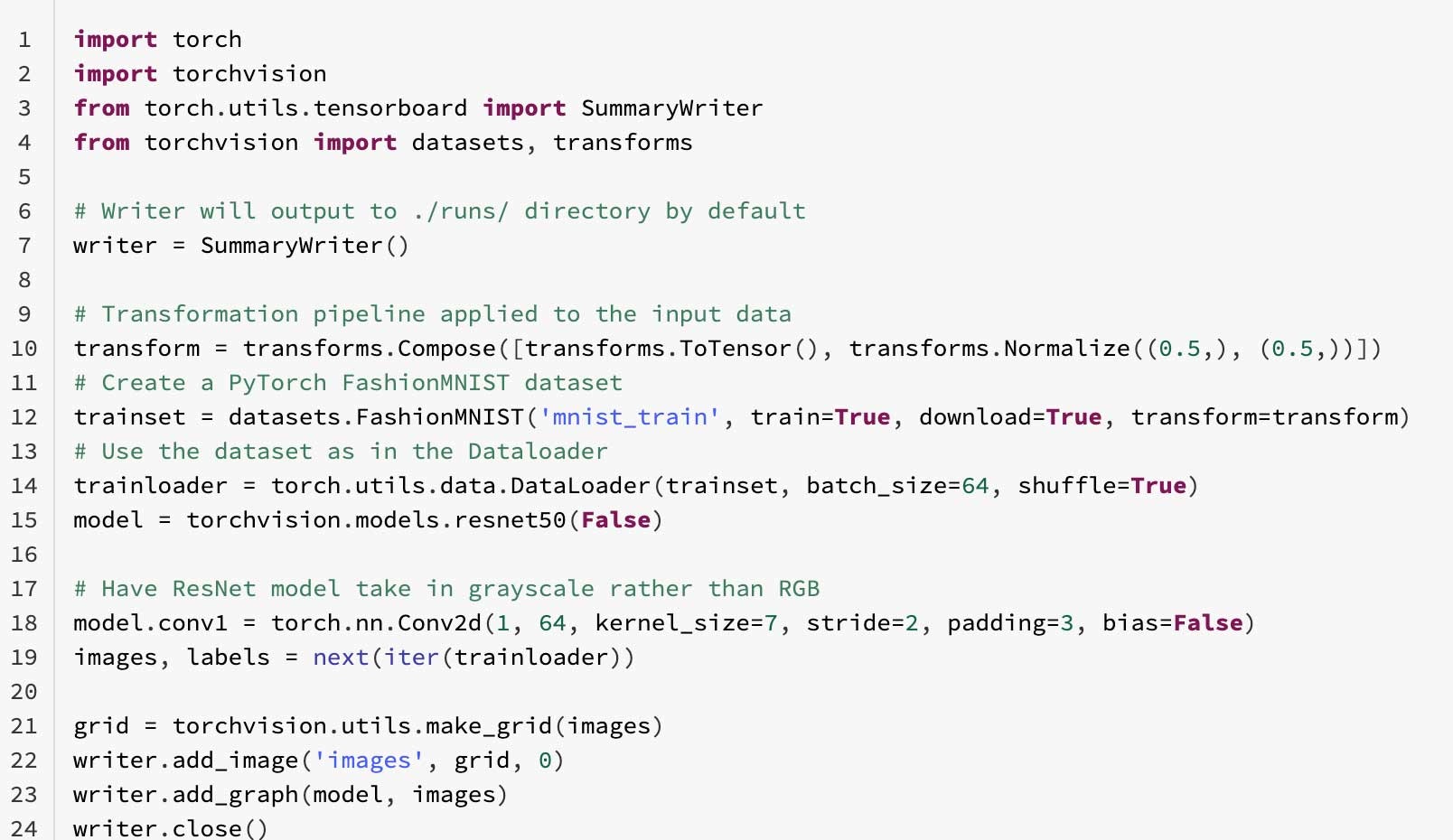 PyTorch FashionMNISTサンプルを実行してTensorBoardのロギングを体験してみましょう。最初に、SummaryWriterを定義し、PyTorchのtorchvision.models.resnet50モデルにおけるDataLoaderにFashionMNISTのDatasetを与えます。