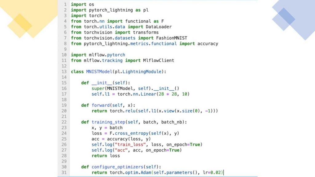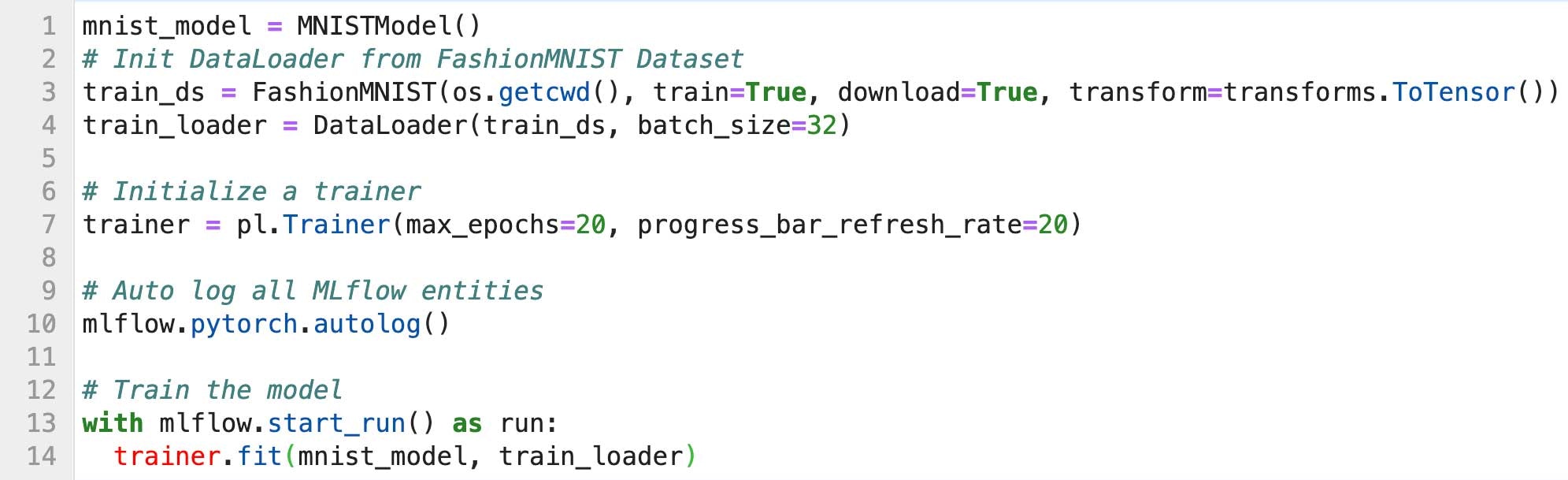 Pythonクラスを作成するのと同じようにPyTorchモデルを作成し、FashionMNIST DataLoader、PyTorch Lightning Trainerを使用し、trainer.fit()メソッドにおけるすべてのMLflowエンティティを自動で記録します。