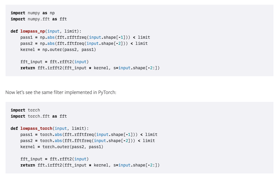 最新のPyTorch 1.8.0リリースでは、さらに高速フーリエ変換において、PyTorchのtensorとNumPyの間で同等のオペレーションを実現しています。