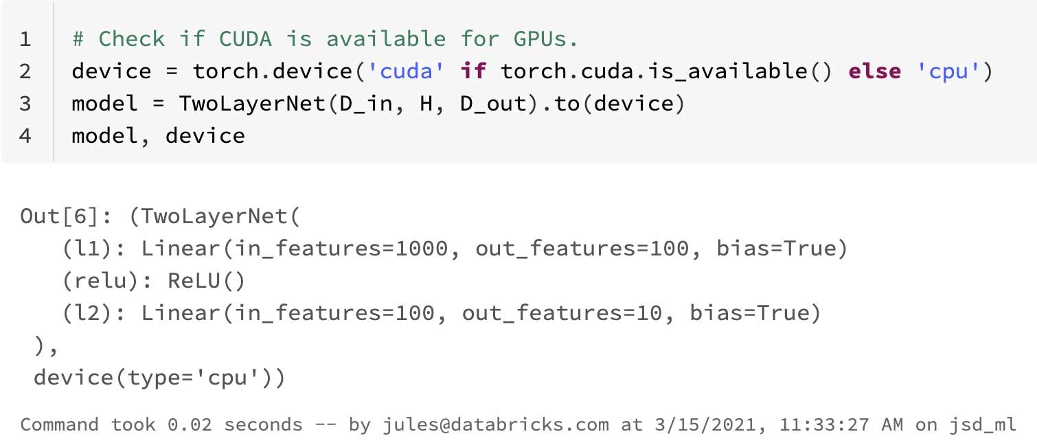 ディープラーニングにおけるニューラルネットワークには、数値主体の計算が含まれ、ここには大規模かつ高ランクのtensorに対する行列操作やドット積が含まれます。GPUを必要とする計算量が多いPyTorchアプリケーションに対しては、GPU対応MLランタイムのクラスターを作成し、データをGPUで処理するように指示します。このようにして、全てのトレーニングはGPUで行われるようになり、上の例ではcudaを用いたTwoLayeredNetの例を示しました。