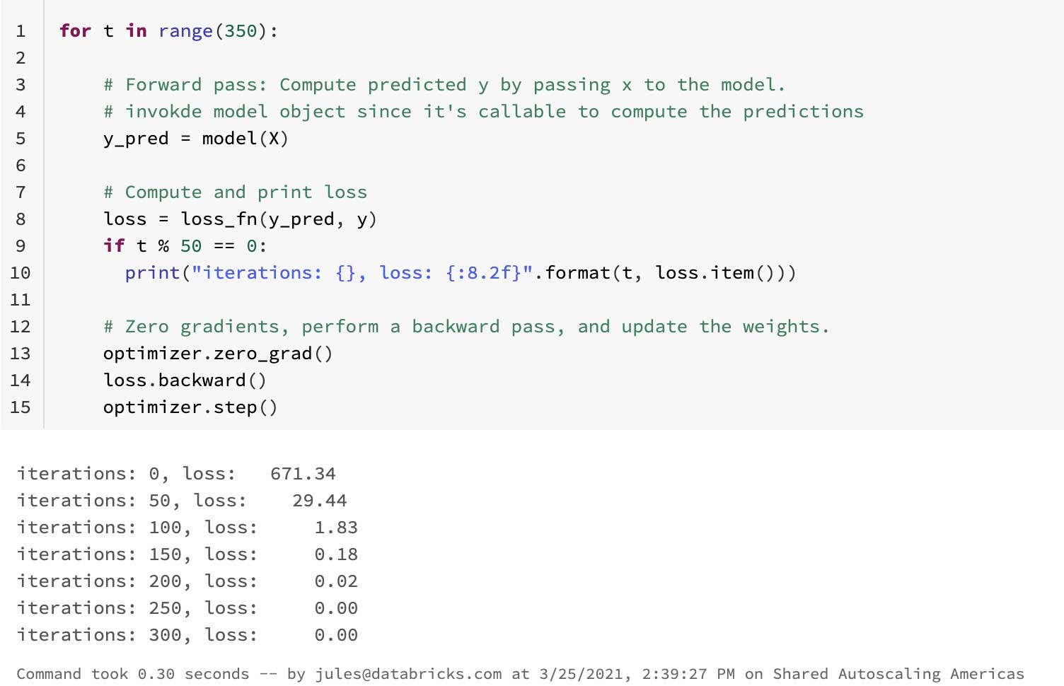さらに、PyTorchコミュニティはスターターチュートリアルとして、素晴らしいLearning with PyTorch Examplesを提供しています。シンプルにコードをDatabricksノートブックにカットアンドペーストするか、Jupyterノートブックをインポートして、Python IDEと同様にMLRで実行できます。これらに取り組んでいる過程で、PyTorchのPythonicかつ必須そして直感的な本質を体感することでしょう。