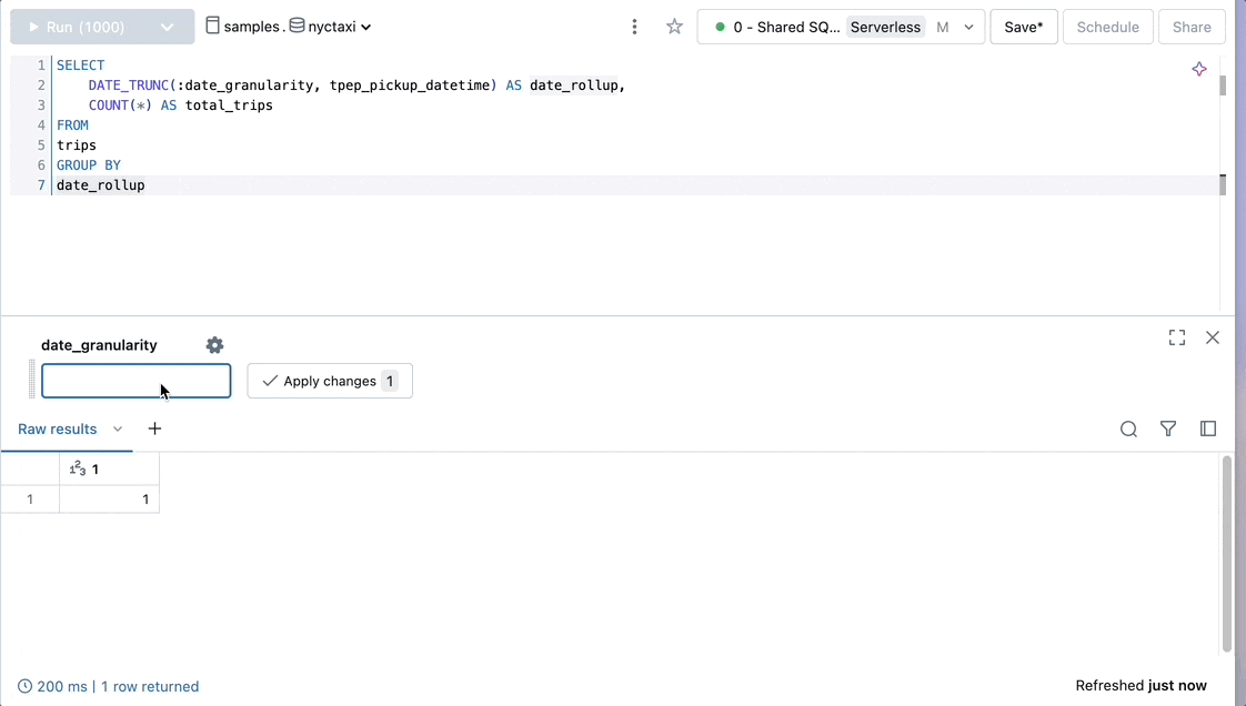 SELECT DATE_TRUNC(:date_granularity, tpep_pickup_datetime) AS date_rollup, COUNT(*) AS total_trips FROM trips GROUP BY date_rollup