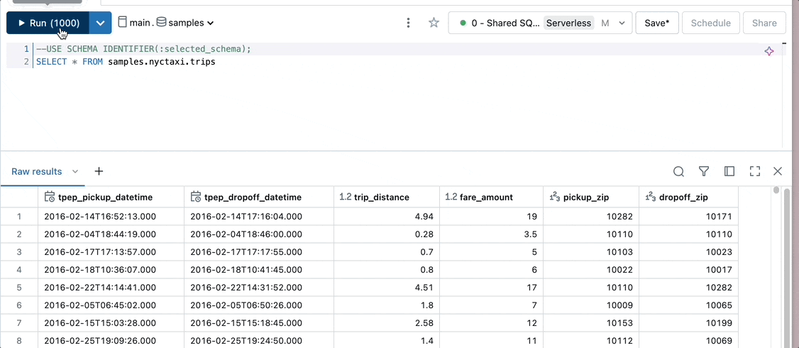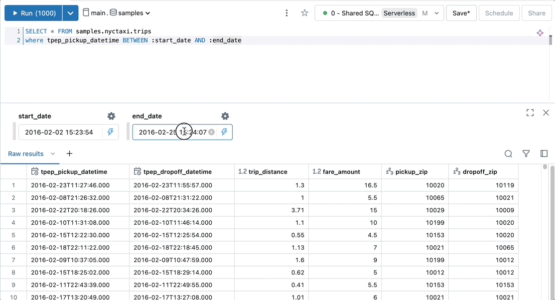 SELECT * FROM samples.nyctaxi.trips where tpep_pickup_datetime BETWEEN :start_date AND :end_date