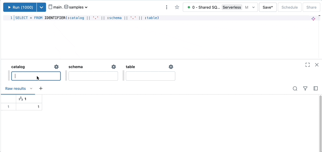 本日、SQLエディタにおける名前付きパラメーターマーカーのサポートを発表できることを嬉しく思っています。この機能によって、構文を変更することなしにダッシュボードやノートブックに直接コピーして実行できる、パラメーター化されたコードをSQLエディタで記述できるようになります。これは、クエリー、ノートブック、ダッシュボードにおけるパラメーターを統合する我々のジャーニーの大きなマイルストーンとなります。
