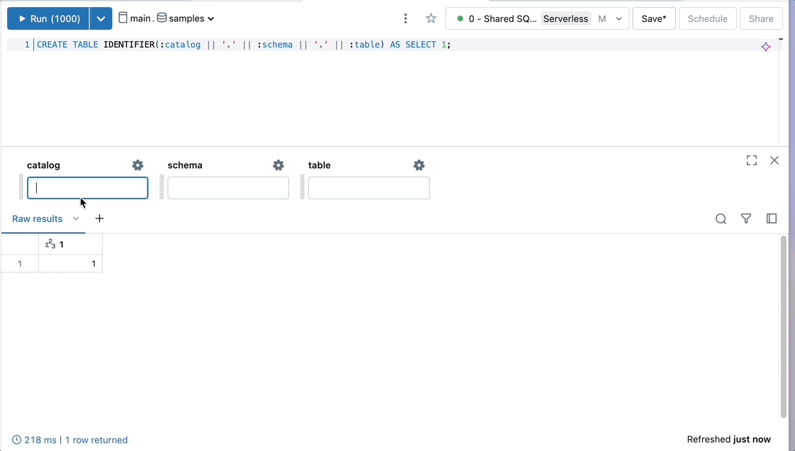 CREATE TABLE IDENTIFIER(:catalog || '.' || :schema || '.' || :table) AS SELECT 1;