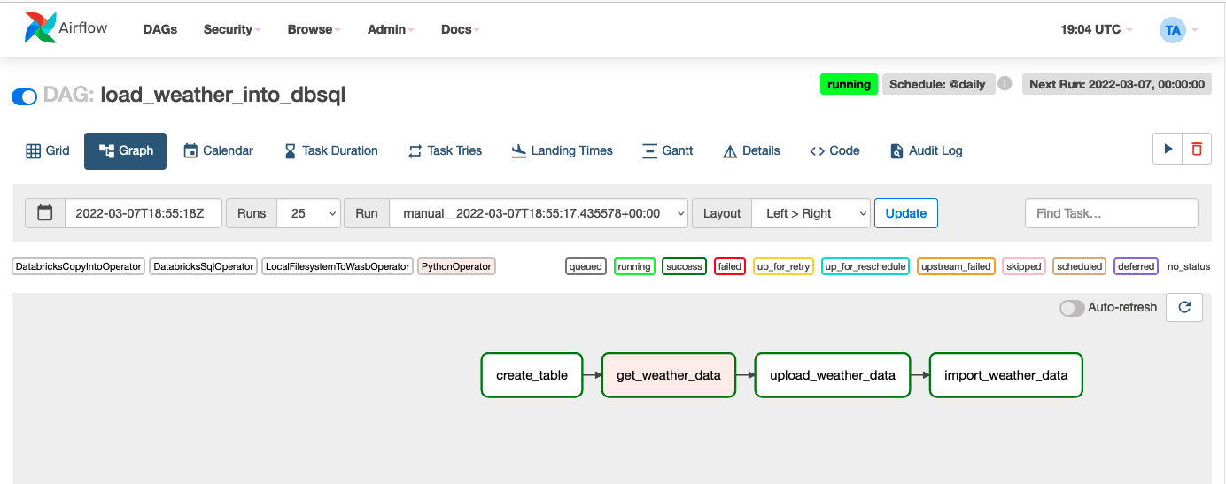 リアルワールドのタスクを通じて新機能のツアーをしていきましょう。Databricksノートブックを使用せずに、APIから新たに取得した気候データをDeltaテーブルにロードするシンプルなデータパイプラインを構築します。この記事の目的のためには、全てのをAzure上で行いますが、プロセスはAWSやGCPでもほぼ同じです。また、全てのステップをSQLエンドポイント上で行いますが、all-purposeのクラスターを使ったとしてもプロセスはほぼ同じです。最終的なサンプルのDAGはAirflowのUI上で以下のようなものとなります。