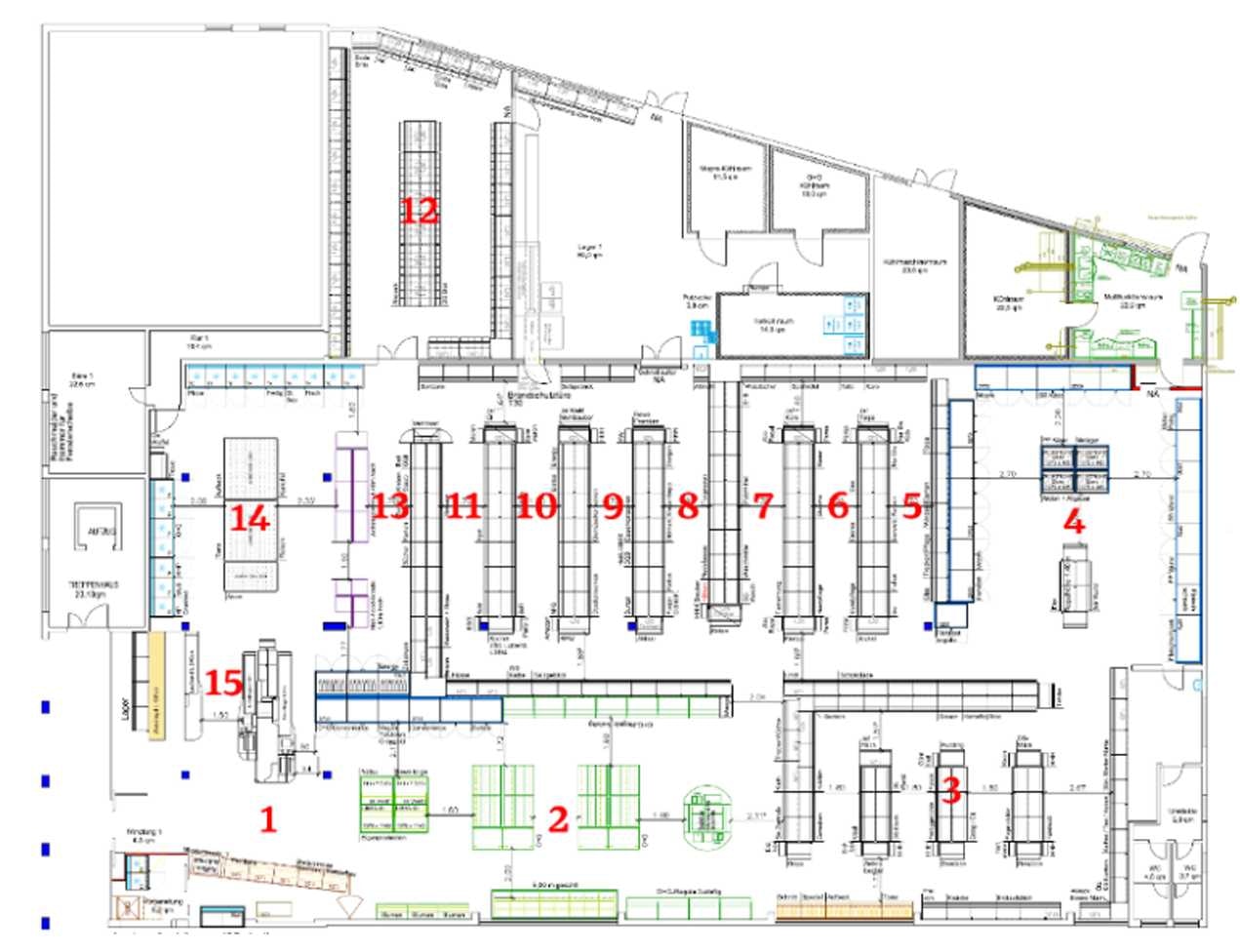 図1: 注文のピッキングを行う店舗のレイアウト、15のゾーンに分割されています。