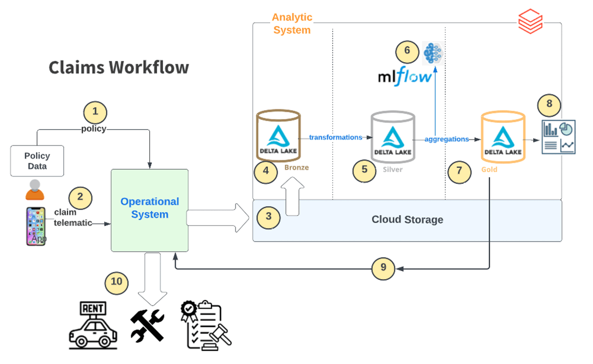 典型的なクレームワークフローには、ガイドワイヤーのようなオペレーショナルシステムとDatabricksのような分析システム間のいくつかのレベルのオーケストレーションが関与します。以下の図では、自動車保険会社のそのようなワークフローの例を示しています。