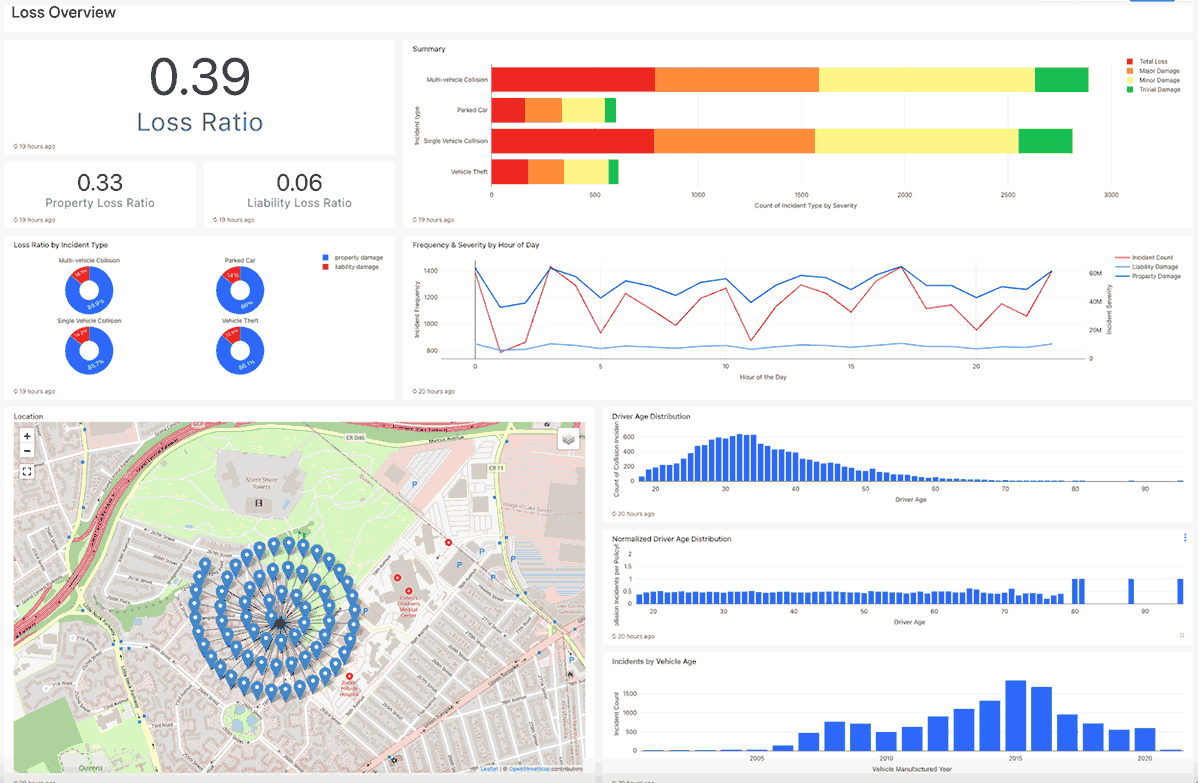 Claims Investigationダッシュボードは、クレームに関するすべての適切な情報を提供することで、迅速な調査を促進し、人間の調査官はダメージを受けた自動車の画像、クレーム、ポリシー、運転手の詳細のような情報を確認するために、特定のクレームをドリルダウンし、テレマティックデータは自動車の経路を描画し、レポートされたデータは評価されたデータ洞察と対比されます。