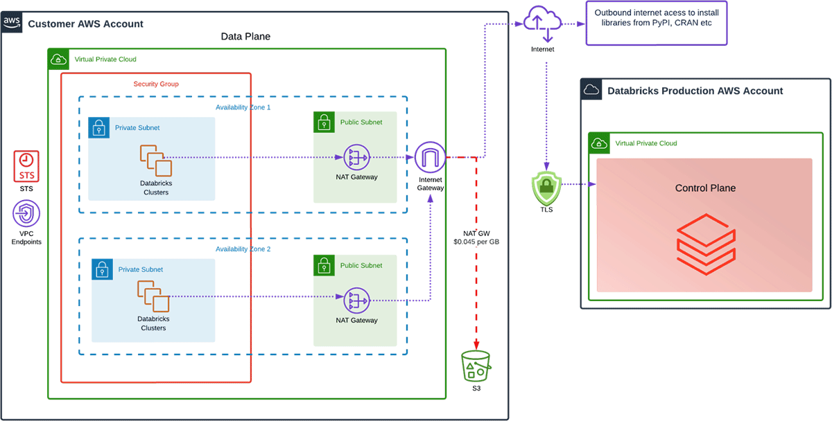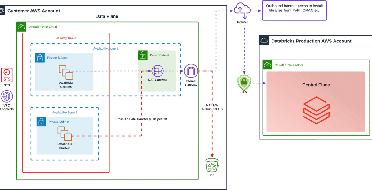 Databricksで最も頻繁に見かけるアーキテクチャは、クラスターに2つのアベイラビリティゾーンを用い、単体のNATゲートウェイを設置し、S3ゲートウェイエンドポイントは無い構成となります。これで何が悪いのでしょうか?動作しますが、このアーキテクチャではいくつかの課題があります。