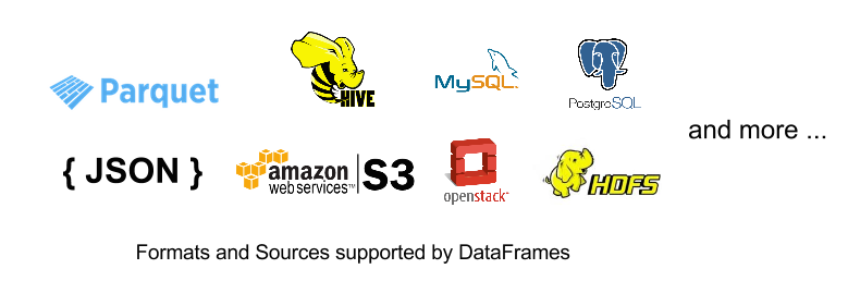 モダンなアプリケーションにおいては、様々なソースからのデータを収集、分析する必要が多くあります。データフレームはアウトオブボックスで、JSONファイル、Parquetファイル、Hiveテーブルを含む様々な人気のあるフォーマットからのデータ読み込みをサポートしています。ローカルのファイルシステム、分散ファイルシステム(HDFS)、クラウドストレージ(S3)、JDBC経由で外部のリレーショナルデータベースから読み込むことができます。さらに、Spark SQLの外部データソースAPIを用いることで、あらゆるサードパーティのデータフォーマット、データソースをサポートするようにデータフレームを拡張することができます。既存のサードパーティ拡張には、すでにAvro、CSV、ElasticSearch、Cassandraが含まれています。