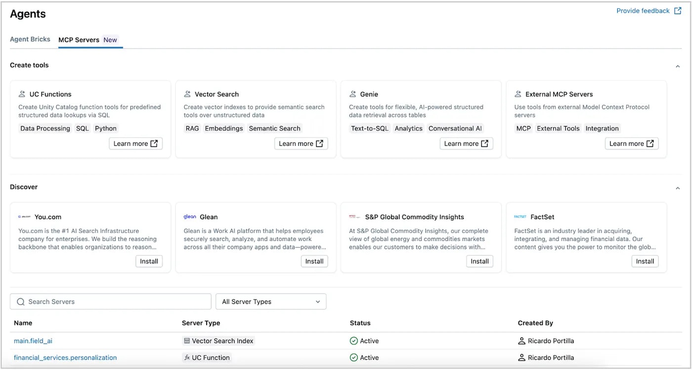 上のコードでは対応していない未解決の複雑性は、ユーザーがツール観点で何が利用可能なのかを理解する助けとなる集中管理されたカタログです。Databricksでは、マネージドMCPサーバーから外部MCPサーバーをカバーし、Unity Catalogでそのようなツールに対するガバナンスやアクセスをシンプルにするMCPカタログでこの問題を解決します。