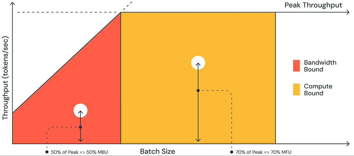 図1. MBU (Model Bandwidth Utilization)とMFU (Model Flops Utilization)の図。MBUとMFUはそれぞれ、メモリーの限界と計算能力の限界に対する割合となります。