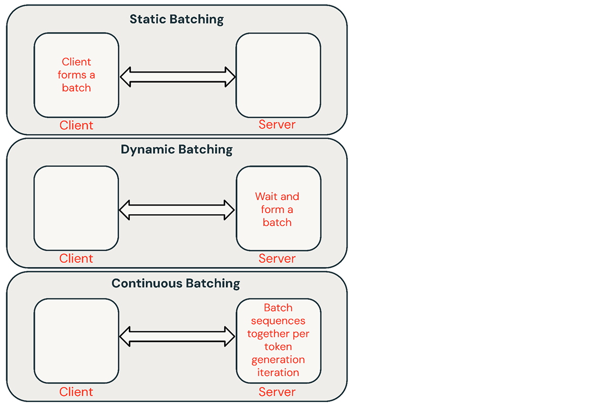 - 静的バッチ: クライアントで複数のプロンプトをリクエストにパッケージし、バッチにあるすべてのシーケンスが完了したあとにレスポンスが返却されます。我々の推論サーバーはこれをサポートしていますがこれを必要とはしません。