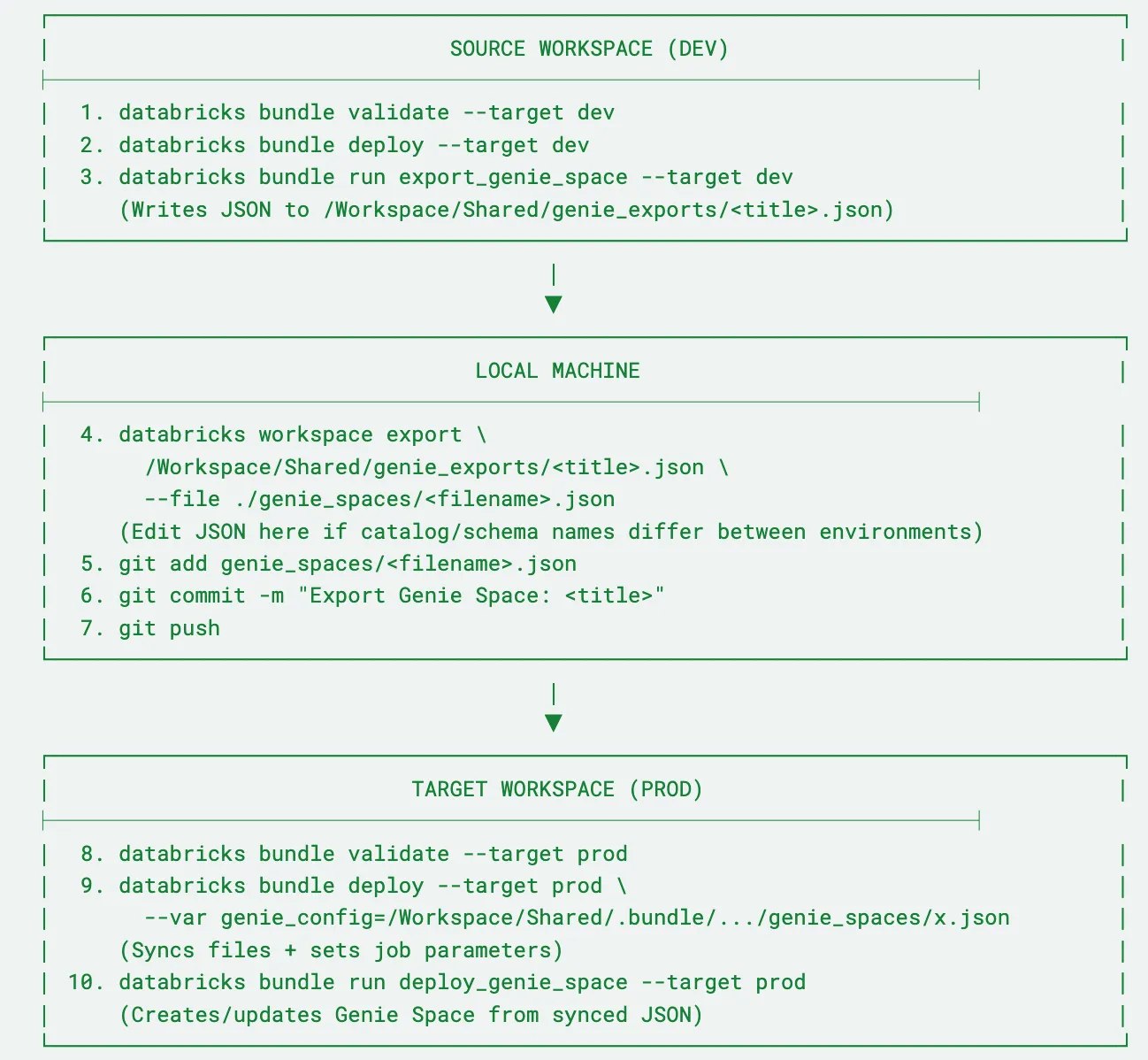 この移行ワークフローは、Genieスペースを開発、本番運用に投入するための堅牢かつプログラムを用いた方法を必要とする企業においては重要なものとなります: