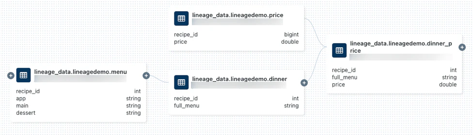 SQLCREATE TABLE IF NOT EXISTS lineage_data.lineagedemo.menu ( recipe_id INT, app string, main string, dessert string ); INSERT INTO lineage_data.lineagedemo.menu (recipe_id, app, main, dessert) VALUES (1,"Ceviche", "Tacos", "Flan"), (2,"Tomato Soup", "Souffle", "Creme Brulee"), (3,"Chips","Grilled Cheese","Cheesecake"); CREATE TABLE lineage_data.lineagedemo.dinner AS SELECT recipe_id, concat(app," + ", main," + ",dessert) AS full_menu FROM lineage_data.lineagedemo.menu
