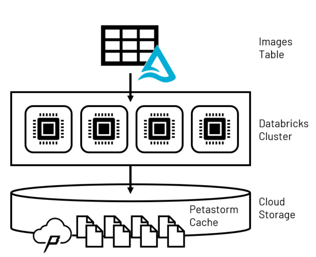 堅牢なモデルをトレーニングするために必要となる、他の大量の画像ファイルと組み合わされる個々の画像ファイルのサイズは、モデルのトレーニングにおいてそれらのファイルをどのように取り扱うのかについて注意深く検討する必要があることを意味します。モデルへの入力をpandasデータフレームにまとめるようなデータサイエンスの取り組みで一般的に使われるテクニックは、エンタープライズ規模においては、個々のコンピューターのメモリーの制限のため、多くの場合うまく動きません。コンピューティングクラスターとして設定された複数のコンピューターノードにデータボリュームを分散するSpark™データフレームは、多くのコンピュータービジョンライブラリではアクセスできないので、この問題に対する別のソリューションが必要となります。このモデルトレーニングの最初の問題を解決するために、先進的ディープラーニングモデルタイプの大規模トレーニングに特化したキャッシングテクノロジーであるPetastormを活用することができます。Petastormを用いることで、レイクハウスから大規模データを取得し、一時的なストレージベースのキャッシュに保存することができます。ディープニューラルネットワーク開発で最も人気があり、一般的にコンピュータービジョンアプリケーションで用いられている2つのライブラリであるTensorflowとPyTorchは、より大規模なPetastormデータセットに対してイテレーションを行うことで、キャッシュからバッチで小規模なデータのサブセットを読み込むことができます。