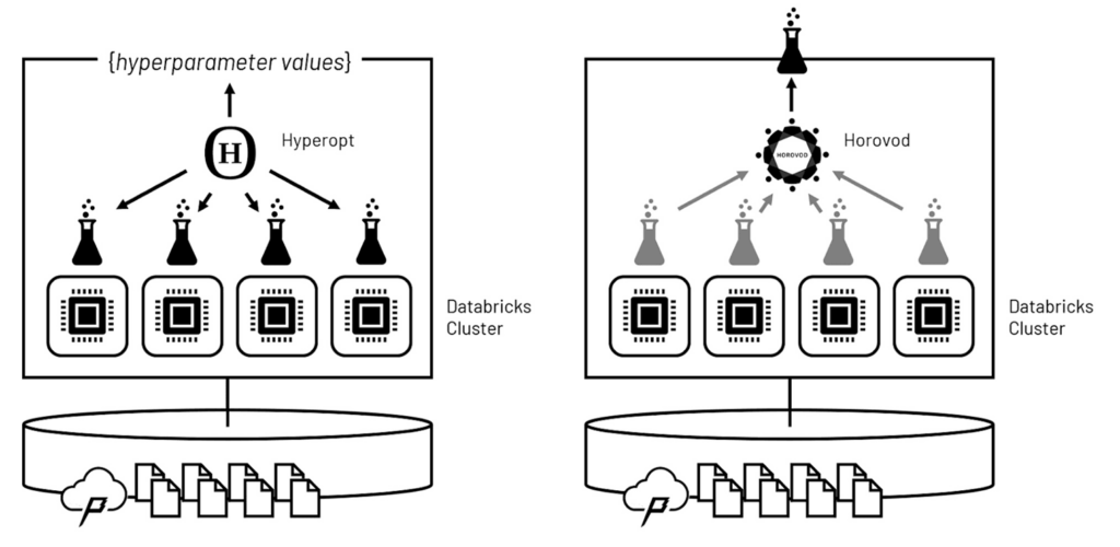 図3 ハイパーパラメーターチューニングとモデルトレーニングそれぞれを分散するためにHyperoptとHorovodを活用