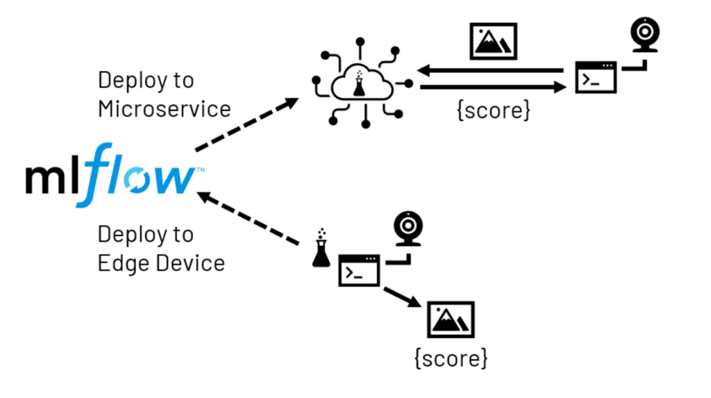 マイクロサービスのデプロイメントにおいては、モデルはネットワークからアクセス可能なサービスとして提供されます。このサービスは集中管理された場所、あるいは、いくつかのエッジデバイスに近い場所になるように複数の場所でホスティングされます。デバイスで稼働するアプリケーションは、必要なスコアを受け取るために画像をサービスに送信します。このアプローチには、モデルのホスティングに大きな自由度があることと、通常エッジデバイスで利用できるよりもはるかに多くのリソースにアクセスできるメリットがあります。一方で、追加のインフラストラクチャが必要になり、ネットワークの遅延、アプリケーションに影響を及ぼす障害のリスクといったデメリットも存在します。