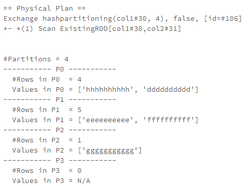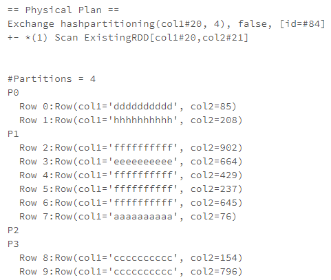 repartitionでhashPartitioningが使われることを示しています。 - データフレームのパーティションの数と、それぞれのパーティションの中身。