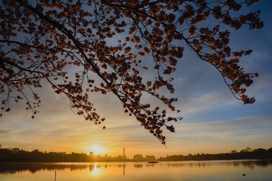 この画像は、私が初めて訪れた場所です。この画像は、日本の春の景色を表しています。樹の花が咲いていることから、春の季節です。樹の花は、紅色であり、広く開いています。その中に、日の光が洗り、水面に反映されています。この場所は、湖の岸にあり、湖の中には、船が泊