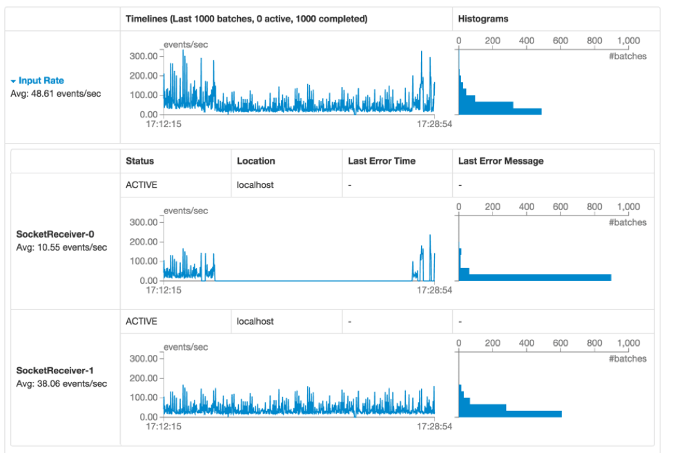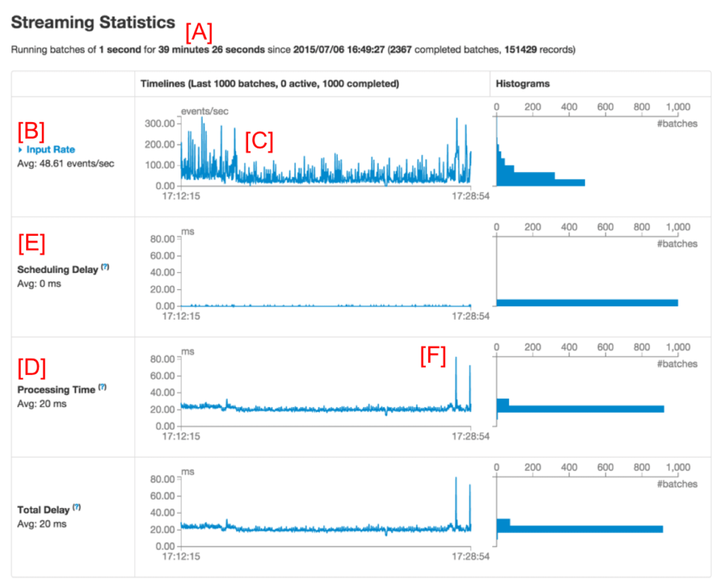このページの下(図1の**[D])をさらに見ていくと、Processing Timeには、平均20msでバッチが処理されていることが表示されています。バッチ間隔(この例では1秒)よりも短い処理時間は、バッチは作成されるとすぐに処理されており、(図1で[E]**で示されており、前回のバッチが完了するまでのバッチの待ち時間として定義される)Scheduling Delayがほぼゼロであることを意味しています。Scheduling delayはお使いのストリーミングアプリケーションが安定しているか否かを示す重要なインジケーターであり、このUIによって容易にモニタリングすることができます。