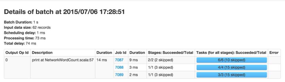 図6は、3つのバッチからのデータに対するワードカウントを行うSparkジョブに関して多くの情報を提供します。