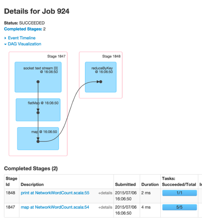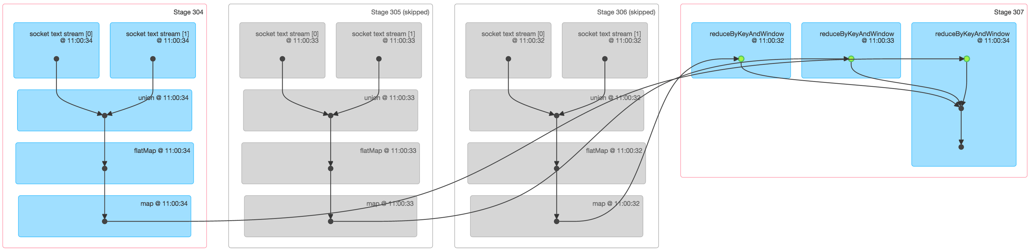 黒のドットは、16:06:50のバッチのDStreamによって生成されたRDDを表現しています。青で塗られたボックスはRDDを変換するために使われたDStreamオペレーションを参照しており、ピンクのボックスはこれらの変換が行われるステージを表現しています。これは全体的に以下のことを示しています。