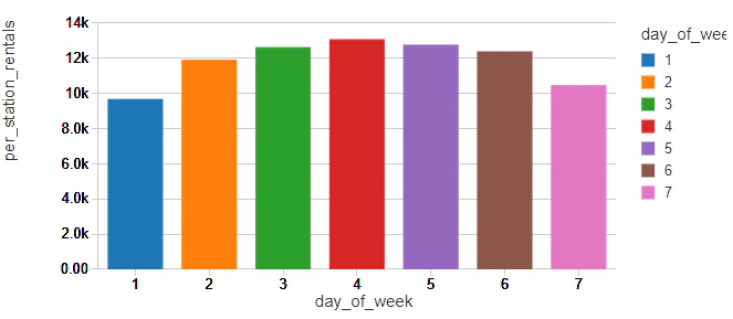 日曜日が1で土曜日が7で表現される曜日ごとの傾向を見ると、他の自転車シェアリングプログラムで見られるのと同様に、ニューヨーカーは自転車を通勤手段として使っていることがわかります。