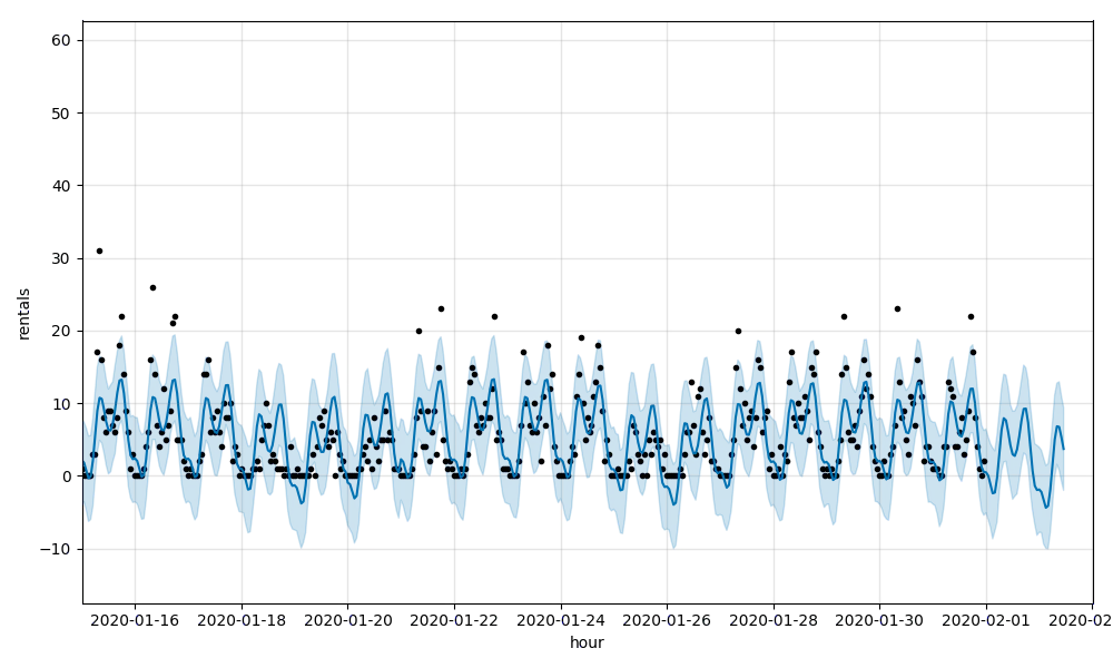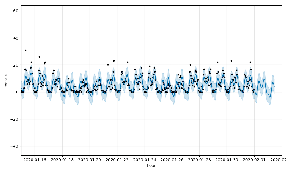 ステーションごとの自転車レンタルを予測するに際して、我々は時系列予測で人気の高いPythonライブラリのFacebook Prophetを利用します。モデルは日次、週次、年次の季節性パターンの線形増加を探索するために設定されています。休日が関連づけられた期間データセットを用いることで、アルゴリズムによって抽出された全体傾向、季節性に対して、特異点が影響を及ぼすことを避けることができます。
