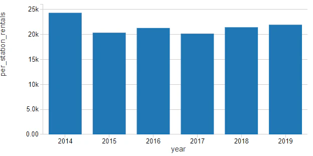 ネットワークにおけるレンタルステーション数でレンタル数を正規化すると、ステーションあたりの利用者数は過去数年間で徐々に増加しているのがわかります。