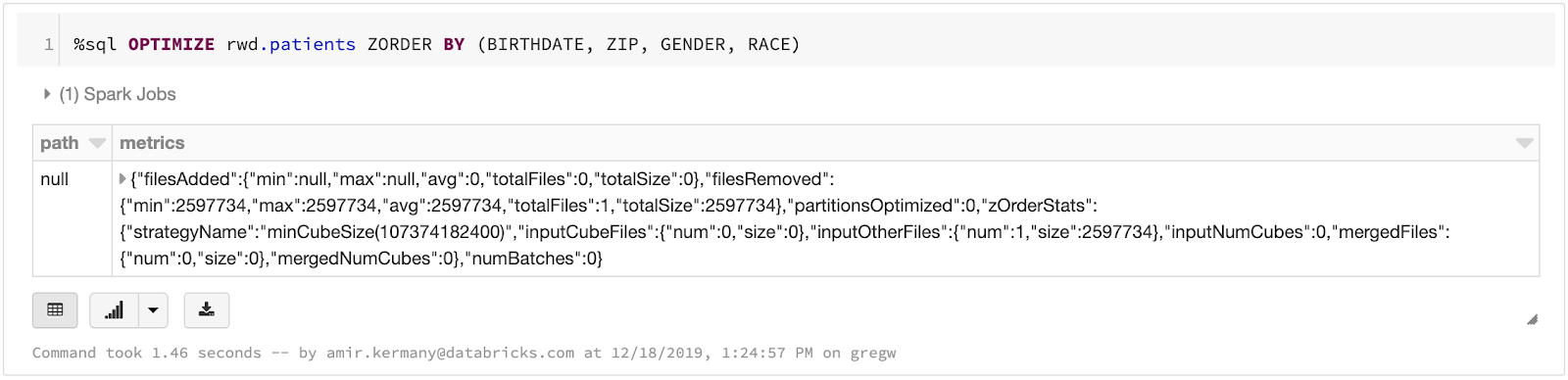 データをDeltaにロードした後で、シンプルなSQLを実行することでテーブルを最適化することができます。我々の併存症状予測エンジンでは、患者IDと評価された症状の両方に対して迅速にクエリーを実行したいと思います。Delta LakeのZ-orderingコマンドを実行することで、それぞれの次元に対するクエリーが迅速に実行されるように最適化を行うことができます。ダッシュボードで必要となるデータ表現を構築するために、複数のシルバーテーブルを結合することで生成した最終的なゴールドテーブルに対して最適化を行っています。