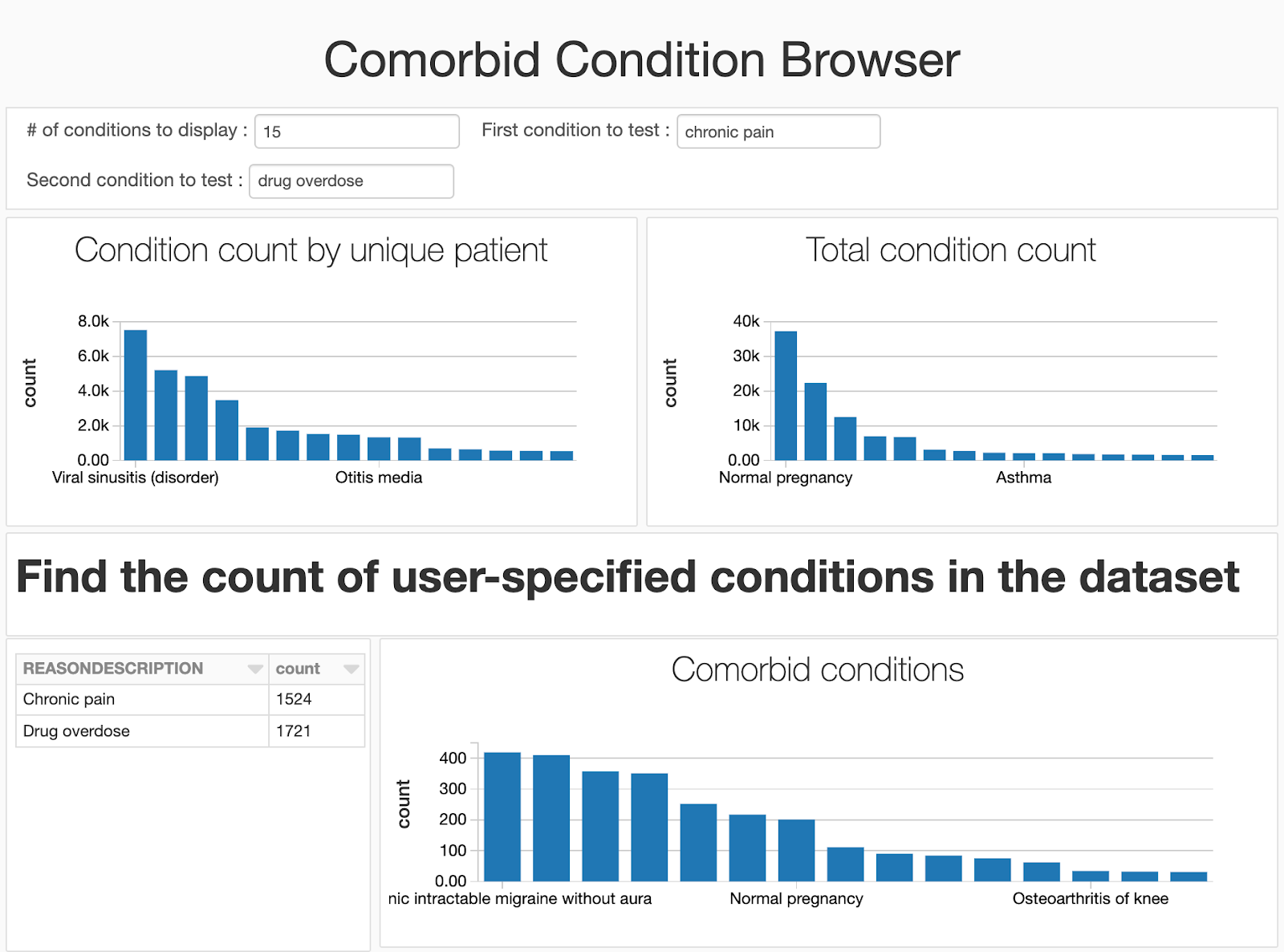 これでデータセットの準備ができましたので、併存症状、すなわち、一人の患者で共通して発生する症状を探索するためのダッシュボードを構築します。ある時には、これらは前兆、リスク要因となりえます。例えば、高血圧は心筋梗塞や他の心臓結果に関する疾病のリスク要因としてよく知られています。併存症状や健康に関する統計情報を発見、モニタリングを行うことで、リスクを特定し、予防策を患者へアドバイスすることで患者のケアを改善することができます。最終的には、併存疾患を特定は件数をカウントするエクササイズになります!症状Aと症状Bを両方持つ患者のセットを特定する必要があります。これはSpark SQLを用いて全てをSQLで処理することができます。我々のダッシュボードでは、シンプルな3つのプロセスを踏みます。