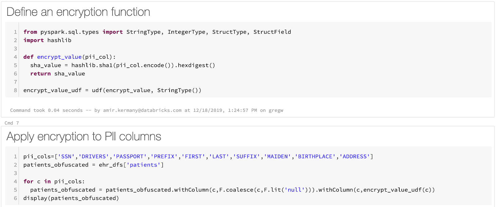 生のCSVのDelta Lakeテーブルへのロードは単純なプロセスです。Apache SparkはCSVのロードをネイティブでサポートしており、ファイルごとに1行のコードでファイルをロードすることができます。SparkはPHIをマスキングするビルトインの機能を提供していませんが、PHIやPIIをマスキングするための任意の関数を定義するために、Sparkの豊富なユーザー定義関数(UDF、AWS|Azure)を活用することができます。我々のサンプルノートブックでは、SHA1ハッシュを計算するためのPython関数を使用します。最後に、1行のコードでデータをDelta Lakeに保存します。