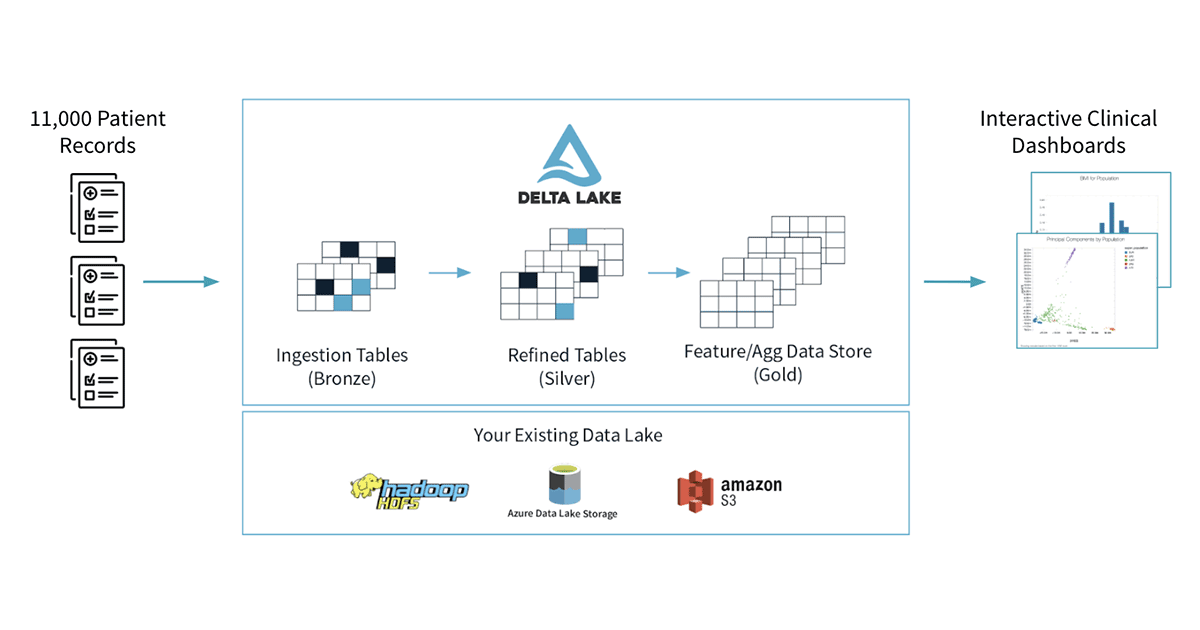 幸運なことに、ビッグデータワークロードに対してACIDトランザクションを導入するオープンソースストレージレイヤーであるDelta Lakeや、Apache SparkTMを用いることで、様々なデータに対する多次元クエリーを高速に実行できるトランザクション対応ストレージと、豊富なデータサイエンス向け機能を提供し、これらの課題の解決をサポートします。Delta LakeとApache Sparkを用いることで、ヘルスケア企業は、分析や機械学習に使えるスケーラブルな医療データレイクを構築することができます。