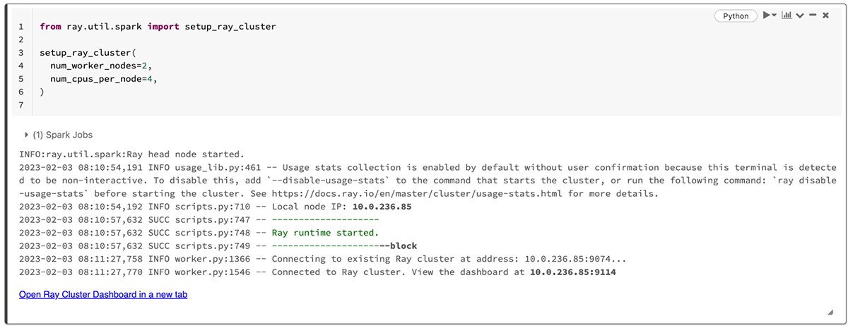 DatabricksあるいはSparkクラスターでRayをスタートするには、シンプルに最新バージョンのRayをインストールし、ray.util.spark.setup_ray_cluster()関数を呼び出し、Rayワーカーの数と計算リソース割り当てを指定します。Databricks Runtimeバージョン12.0以降のDatabricksクラスター、バージョン3.3以降のSparkクラスターであればサポートされています。例えば、以下のコードはDatabricksノートブックでRayをインストールし、2つのワーカーノードでRayクラスターを初期化します。